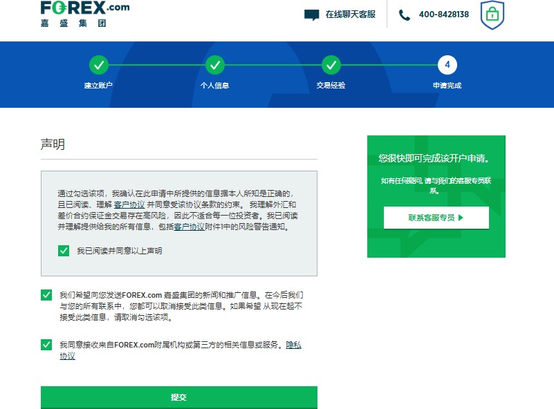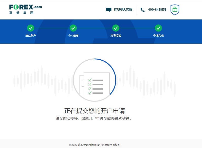 提交完成后账户会进入智能审核阶段,在此期间您无需提交额外材料,如有材料需要补充,嘉盛会通过邮件/电话的形式与您取得联系。