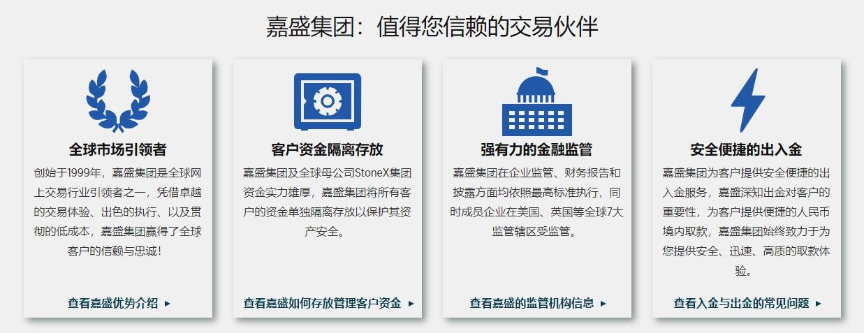 嘉盛集团创始于1999年,是全球网上交易行业引领者之一。自成立以来,嘉盛迄今已为来自全球180多个国家超过14万零售客户和机构投资者提供执行、清算、维护等服务和技术产品,资产超过14.5亿美金(根据2018年第一季度数据)。嘉盛集团致力于为全球个人投资者提供外汇、贵金属、股指等产品的透明报价及优质执行、高端交易工具、丰富的市场观点及教育资源。