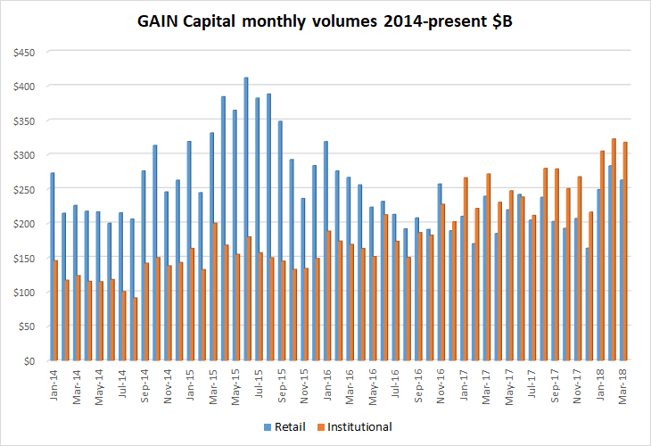 整个第一季度,嘉盛零售外汇交易量总计7950亿美元,每月平均2650亿美元,高于整个2017年月均值2060亿美元。